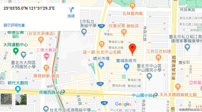 | 주소Adress | 台北市中山區雙城街19巷6F(14층건물) |