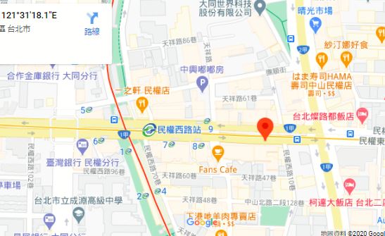 | 주소Adress | 台北市中山區民權西路9巷22號5F(14층 건물) |