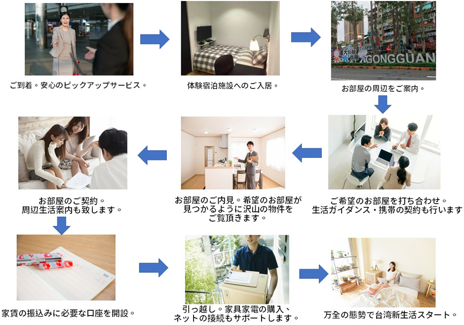 | 第一週前半 | ・空港ピックアップ ・体験宿泊施設への入居及び周辺案内 ・台北住宅事情及び現地生活事情ガイダンス ・内見を希望されるお部屋に関する打ち合わせ ・携帯電話(SIMカード)の契約 |