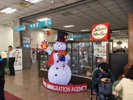 上でもふれたように、この地区には多くの政府関連機関が集まっています。総統が指揮を執る総督府も、小南門駅と台北駅の間に位置しています。他には、最高裁判所や首相官邸などもすべてここに集まっています。そして外国人なら、何度もお世話になる移民局(写真下段)の最寄り駅も小南門です。インドネシア人の学生が手作りしたと思われる雪だるまが置いてありました。居留証に申請や、ビザの延長などはすべてここで行います(注:台北市に住んでいる方のみ)。