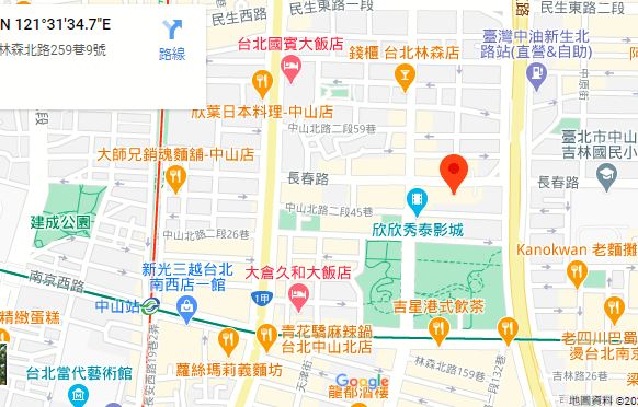 | 주소Adress | 台北市中山區林森北路259巷7號3F(7층 건물) |