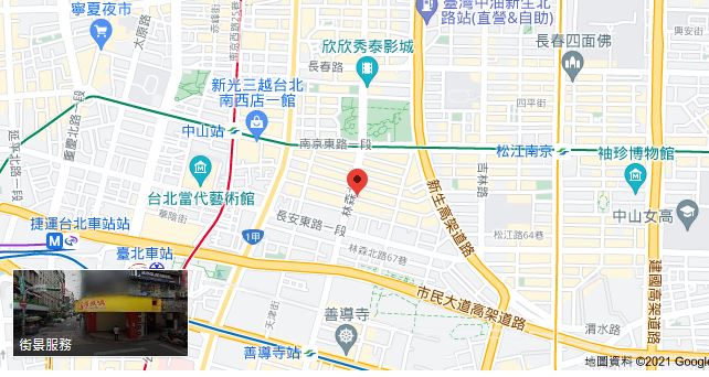 | 住所Adress | 台北市中山區林森北路105號8F |