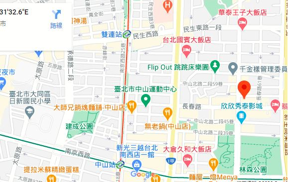 | 住所Adress | 台北市中山區林森北路308號(15층 건물) |