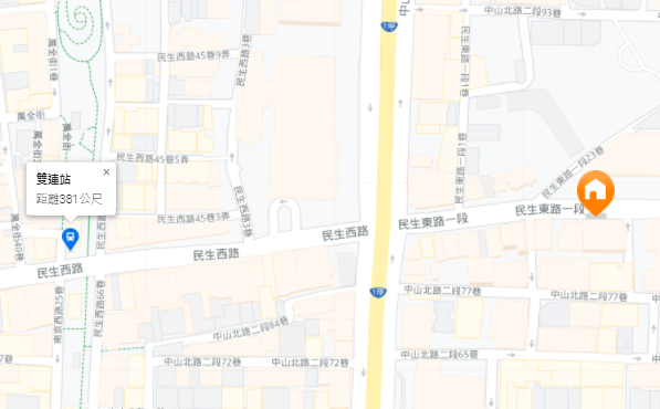 | 近くのスポットNear tourist spot | 닝샤야시장・중산, 솽롄 전통 시장・중산 상가 구역・중산 카페거리・신광미츠코시백화점・린선베이로일본인 거리 등 |