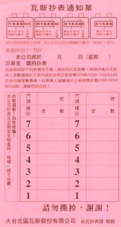 자, 여기까지 들으면 청구된 금액을 지불하면 되니까 간단하지 않나 하고 생각하시는 분들이 많으실 텐데요, 사실은 그렇지 않습니다. ①의 경우, 복잡한 절차는 집주인이 모두 대신 밟아 주기 때문에 간단한 것이 사실입니다. 문제는 ②의 경우입니다. 대만에서는 전력회사 · 수도회사 · 가스회사에 각각, 그 달에 집에서 사용한 (정확히 말하면 2개월마다) 사용량을 자진신고해야 합니다. 그들은 그 신고내용을 토대로 청구서를 보내오기 때문에, 사용량을 알려주지 않으면 청구서도 받을 수 없습니다.