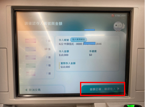 4. 이상이 없다면, 「金額正確,確認存入(금액 확인완료, 예금하기)」를 누릅니다.