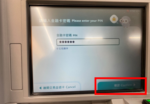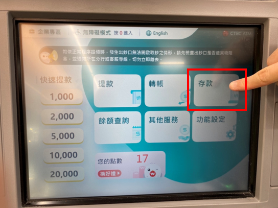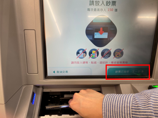 3. 사진과 같이 디스펜서가 열리면, 현금을 ATM에 넣고 빨간색 테두리의 「鈔票以放好,下一步(현금입금 완료, 다음페이지)」를 누릅니다.