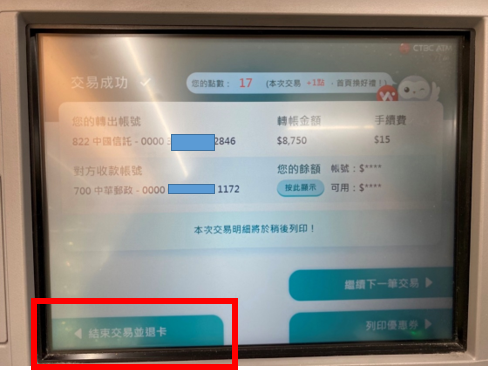 6. 왼쪽 하단의「結束交易並退卡(거래를 종료하고 카드를 반환)」을 누르면 이체절차는 끝입니다.