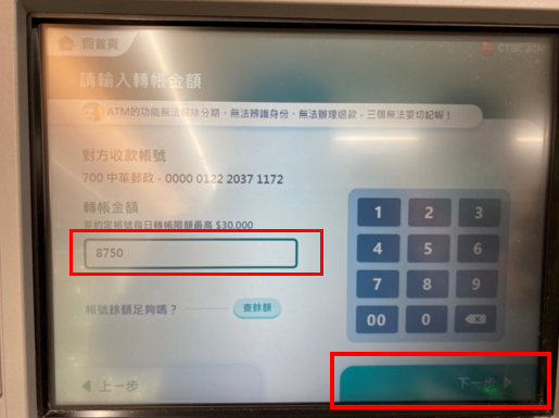 3. 빨간 테두리의「轉帳金額(이체금액)」이라는 칸에 입금하려는 금액을 입력합니다. 입력이 끝나면 「下一步(다음페이지)」를 누릅니다.