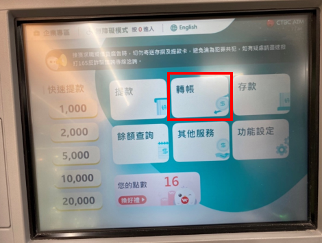 1. 메인 메뉴에서 「轉帳(이체)」를 선택합니다.