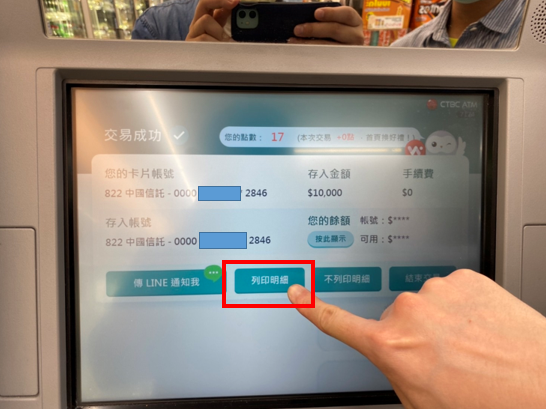 5. 다음 交易成功(거래완료)화면에서 명세서 인출여부를 선택할 수 있으므로, 필요한 경우엔 빨간색 테두리의 「列印明細(명세서 인출)」을 누릅니다. (필요 없을 경우 「不列印明細」를 누르세요)