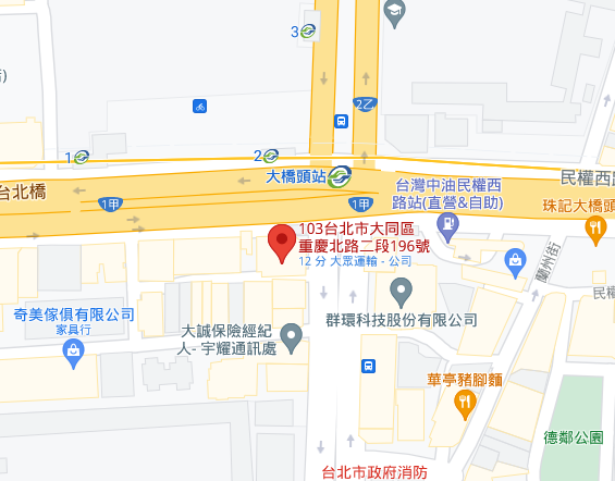 | 주소Adress | 台北市大同區重慶北路二段196號5F(12층 건물) |