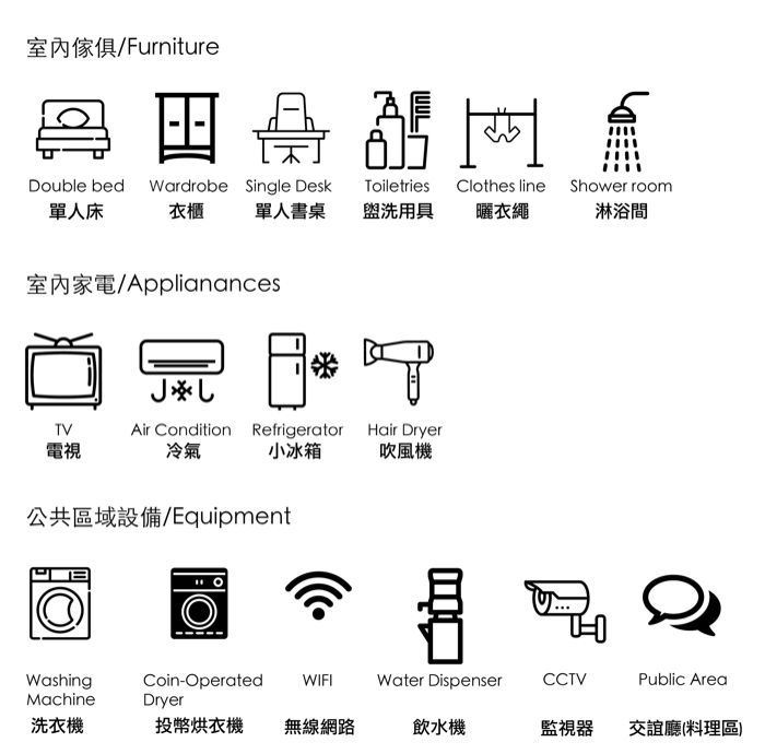 | 월세Rent | ・9개월 이상 계약시:14,000대만달러/월 ・5~8개월 계약시:18,000대만달러/월 ・4개월 이하로 계약시:22,000대만달러/월 ※여름방학 기간(7~8월)은 금액 조절함 |