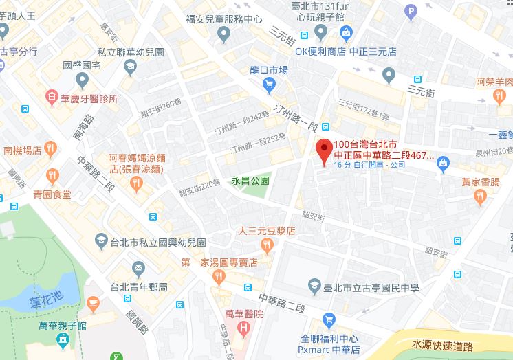 | 주소Adress | 台北市中正區中華路二段467巷70弄5號1~2F(2층 건물) |