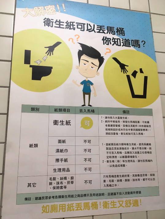 このようなポスターが張られるということは、多くの台湾人も、トイレに紙を流してはいけないと考えているということです。