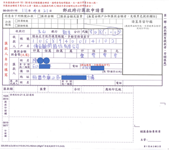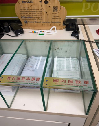 番号を呼ばれたら、番号札・振込用紙・振込むお金を窓口の方に渡せば良いです。なお、郵便局以外の金融機関に振り込む場合には、30元の手数料がかかります。1000元を振り込む場合は、1030元を渡さなければなりません。