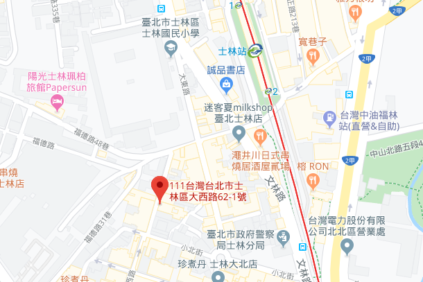 | 住所Adress | 台北市士林區大西路62號4F(5階建て) |