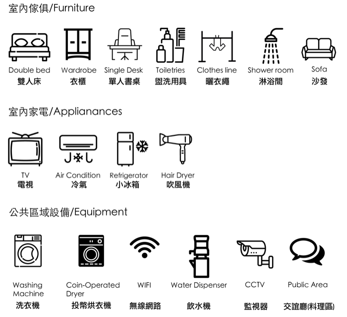 | 家賃Rent | ・9개월 이상의 계약:17,000대만달러/월 ・5~8개월의 계약:22,500대만달러/월 ・4개월 이하의 계약:27,000대만달러/월 ※여름방학 기간(7~8월)은 금액조절함 |