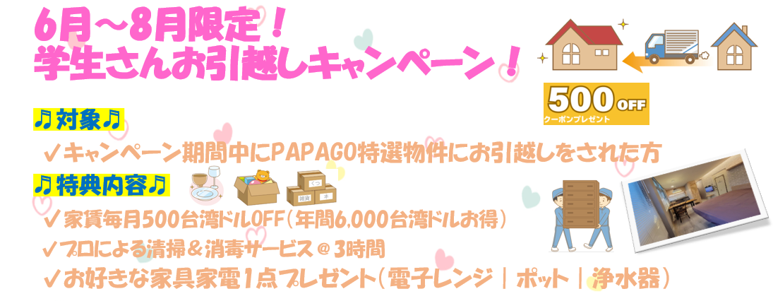 PAPAGO 방 구하기 지원실에서는, 어학연수를 위해 타이베이로 오시는 여러분을 위해 캠페인을 진행하고 있습니다.