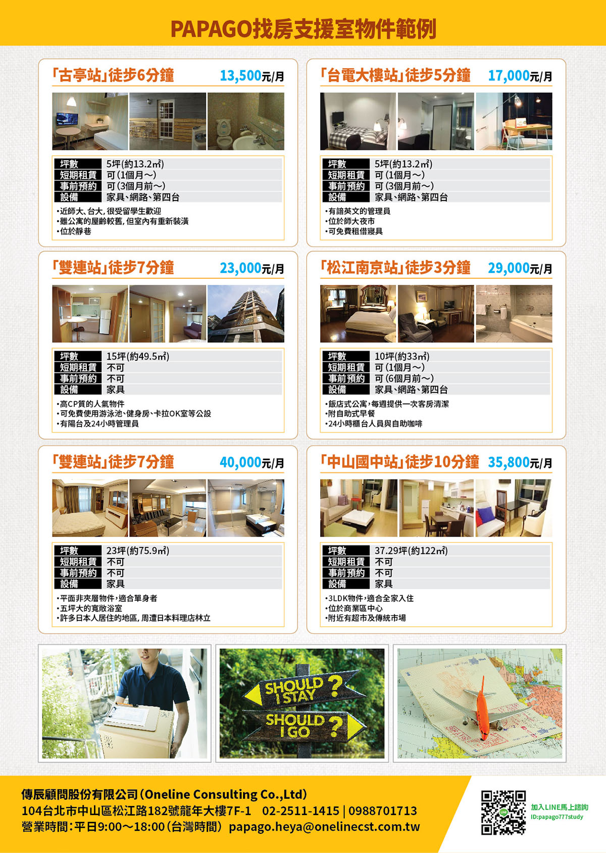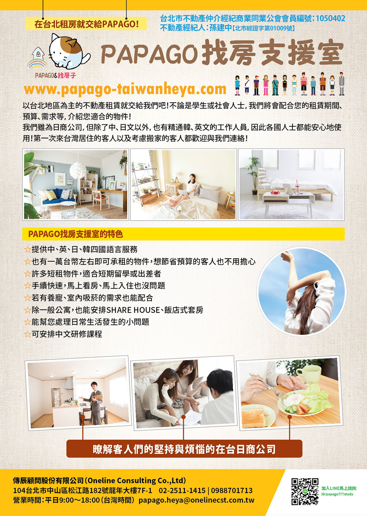 營業時間:平日9:00~18:00(台灣時間) papago.heya@onelinecst.com.tw
