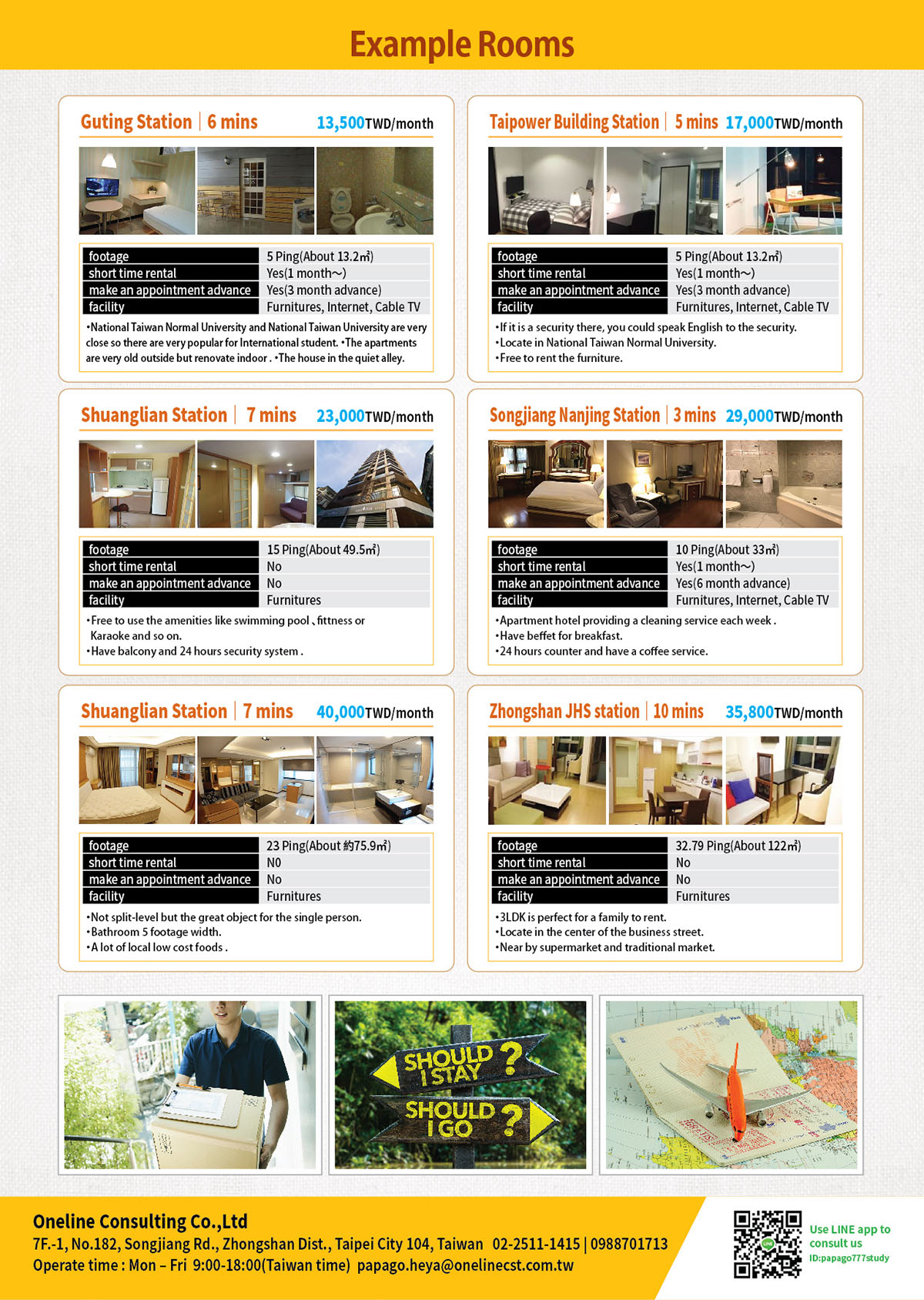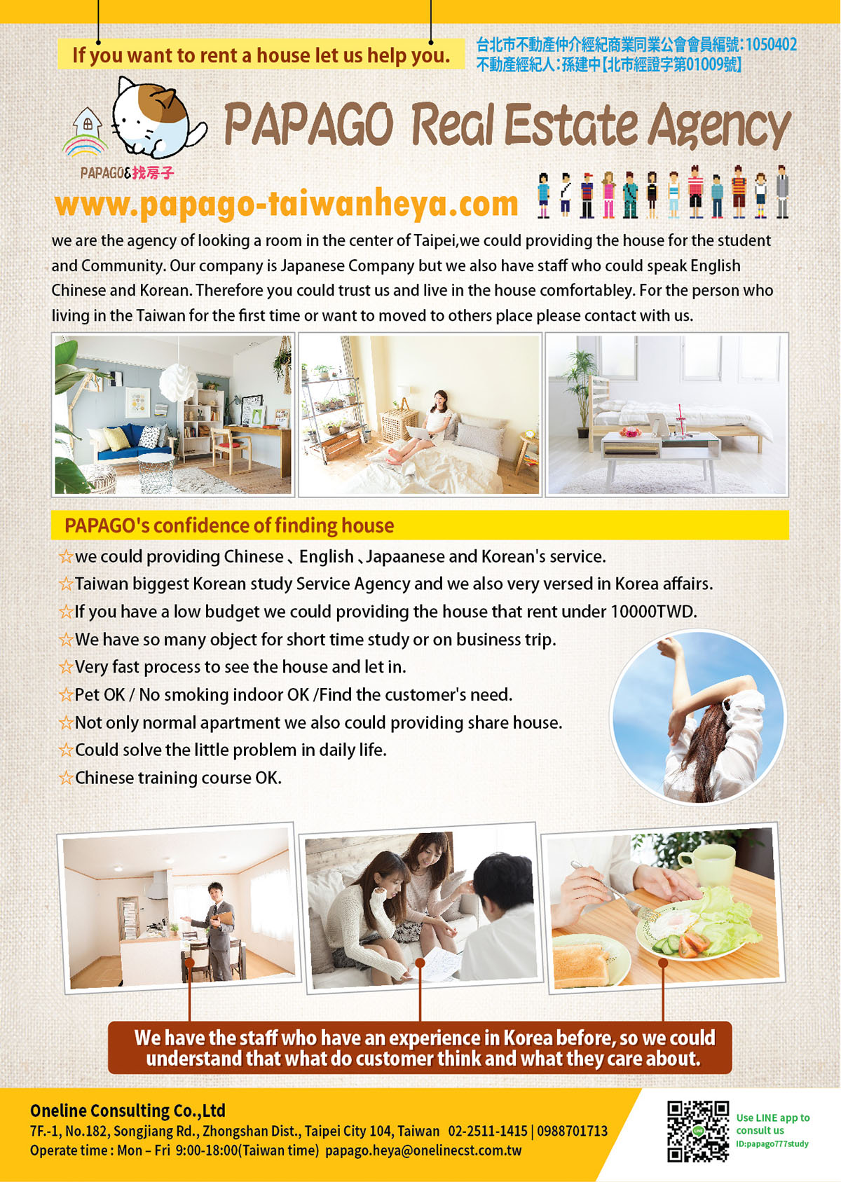 we are the agency of looking a room in the center of Taipei,we could providing the house for the student and Community. Our company is Japanese Company but we also have staff who could speak English Chinese and Korean. Therefore you could trust us and live in the house comfortabley. For the person who living in the Taiwan for the first time or want to moved to others place please contact with us.