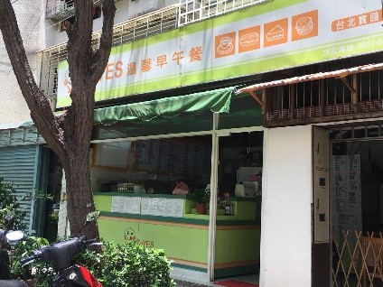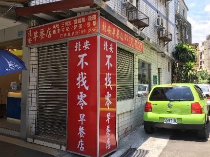 50台湾ドルくらいで食べられる超ローカルなお店も多数。左上のお店は、「不找零早餐店(おつりは渡さない朝ごはん屋さん)」。この日は閉まっていましたが、本当におつりをくれないんでしょうか…。最近は、外国食も増えており、讃岐うどんのお店や、韓国料理、タイ料理などがお薦めです。