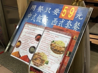 食事はローカルのレストランが点々としていますが、一番お世話になるは台北地下街にあるグルメ街ではないでしょうか?たくさんのお店があり、とにかくコスパがいいです。ピザや、チャーハンなどが60元(約200円)で食べれてしまいます。この値段で食事がとれる場所は、今や台北ではほとんどないのではないでしょうか…。味もそこそこ美味しいですよ。