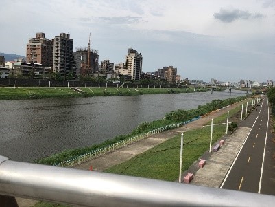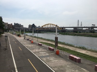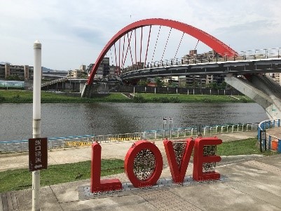 もう少し歩くと、彩虹橋が見えてきます。LOVEの文字が目印です。夜は虹色にライトアップされて、カップルが川沿いにデートしている姿がよく見られます。ジョギングやサイクリングにも最適です。